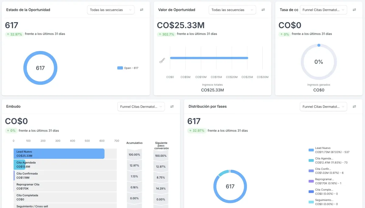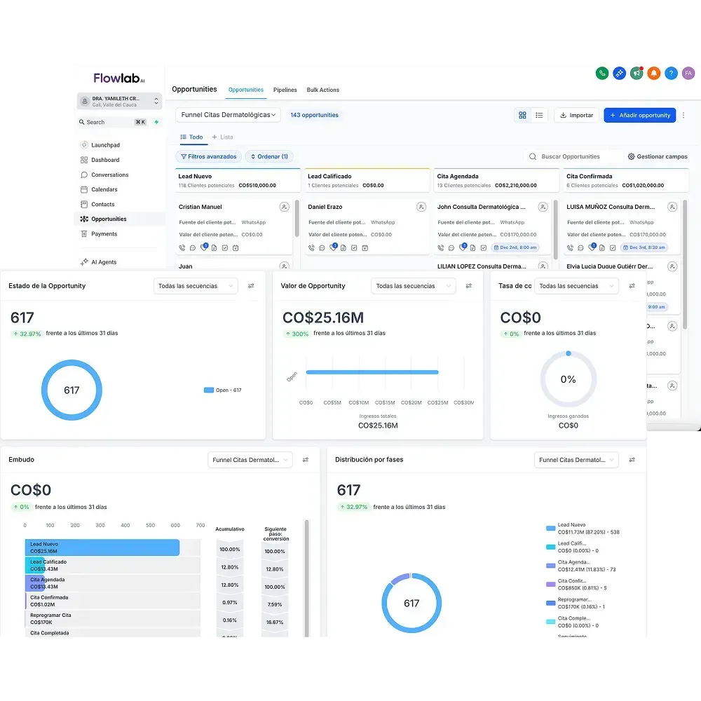 Tu empleado digital analiza conversaciones, oportunidades, tiempos de respuesta y pérdidas, y te muestra un dashboard claro para entender qué está funcionando y qué no. Todo sin que tengas que preparar un solo reporte.
